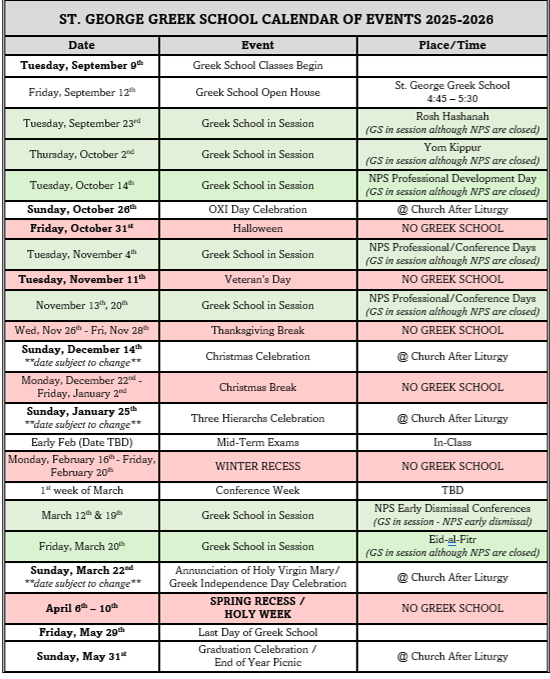 EXCEPTIONS: We WILL have Greek School on the following dates where NPS are either off or have early dismissal:
