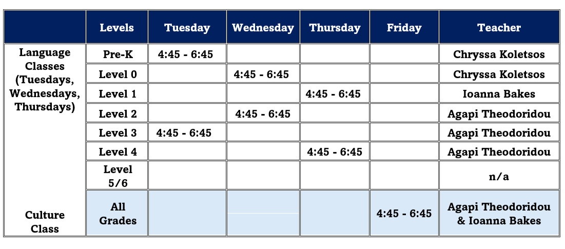 Saint George youth Greek Language & Culture classes are offered as early as PreK (must be 5years old) through Middle School. Classes convene Tuesday through Friday afternoons (dependant on Level) promptly at 4:45 p.m from September through May. Classes end at 6:45p.m.